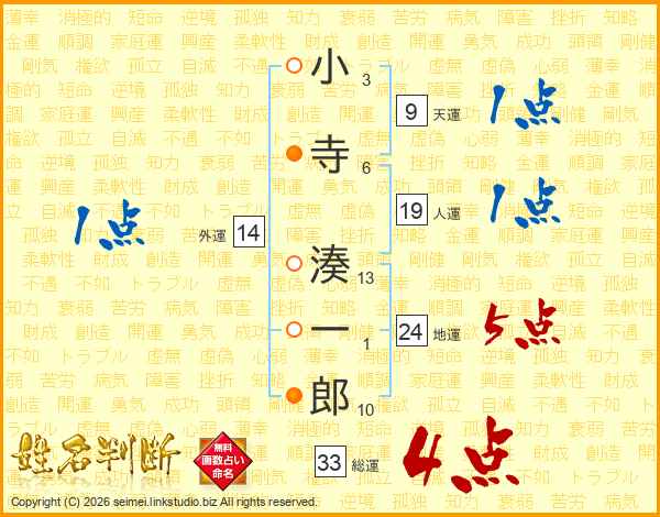 小(3画)寺(6画) 湊(13画)一(1画)郎(10画)
