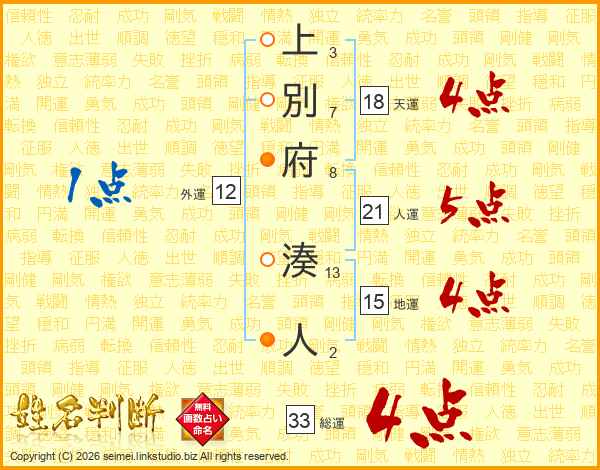 上(3画)別(7画)府(8画) 湊(13画)人(2画)
