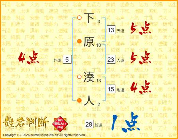 生活面を象徴する運勢です。外部から受ける影響力を表し、結婚運、家庭運や職場、環境への順応性を表します。総運から人運を引いた画数。姓や名が1文字の場合を除く。