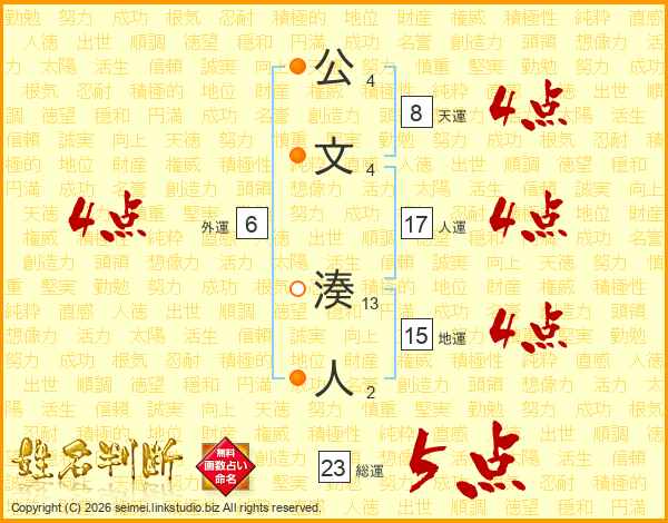 生活面を象徴する運勢です。外部から受ける影響力を表し、結婚運、家庭運や職場、環境への順応性を表します。総運から人運を引いた画数。姓や名が1文字の場合を除く。