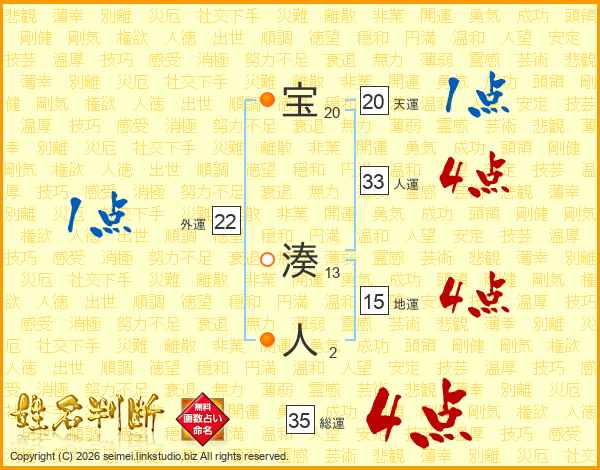 宝(20画) 湊(13画)人(2画)