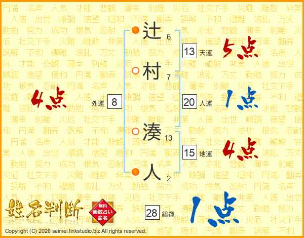 生活面を象徴する運勢です。外部から受ける影響力を表し、結婚運、家庭運や職場、環境への順応性を表します。総運から人運を引いた画数。姓や名が1文字の場合を除く。