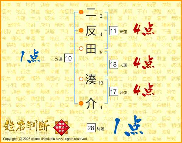 生活面を象徴する運勢です。外部から受ける影響力を表し、結婚運、家庭運や職場、環境への順応性を表します。総運から人運を引いた画数。姓や名が1文字の場合を除く。
