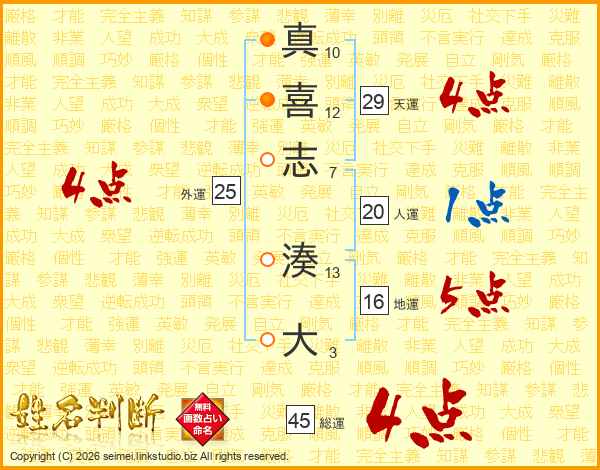 真(10画)喜(12画)志(7画) 湊(13画)大(3画)