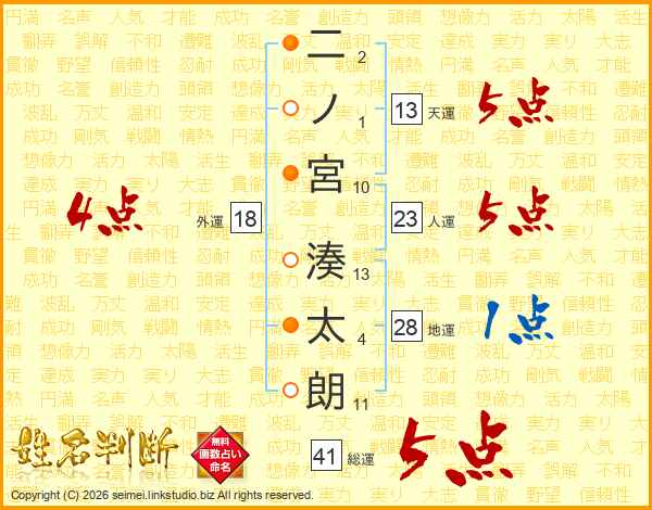 二(2画)ノ(1画)宮(10画) 湊(13画)太(4画)朗(11画)