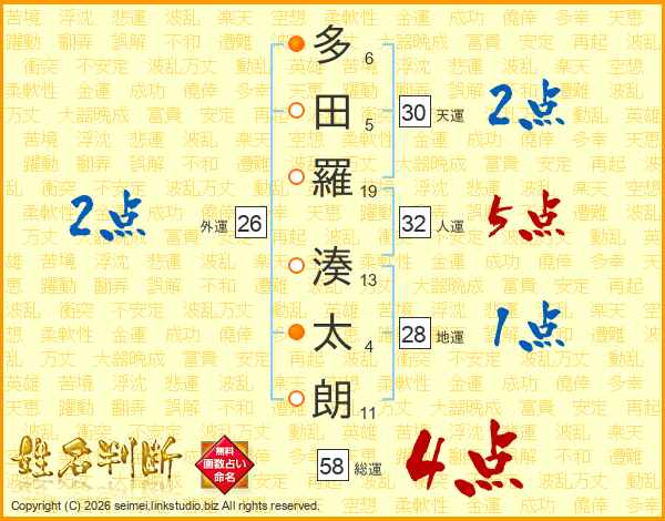 多(6画)田(5画)羅(19画) 湊(13画)太(4画)朗(11画)