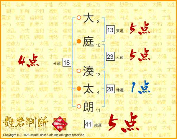 大(3画)庭(10画) 湊(13画)太(4画)朗(11画)