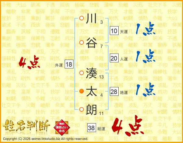 川(3画)谷(7画) 湊(13画)太(4画)朗(11画)