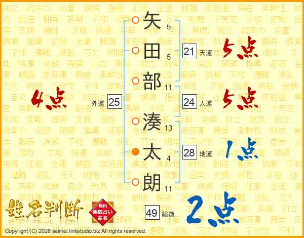 矢(5画)田(5画)部(11画) 湊(13画)太(4画)朗(11画)
