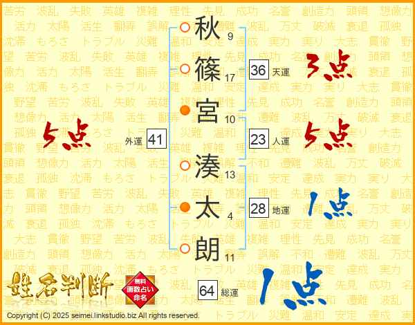 秋(9画)篠(17画)宮(10画) 湊(13画)太(4画)朗(11画)