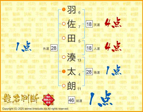 羽(6画)佐(7画)田(5画) 湊(13画)太(4画)朗(11画)