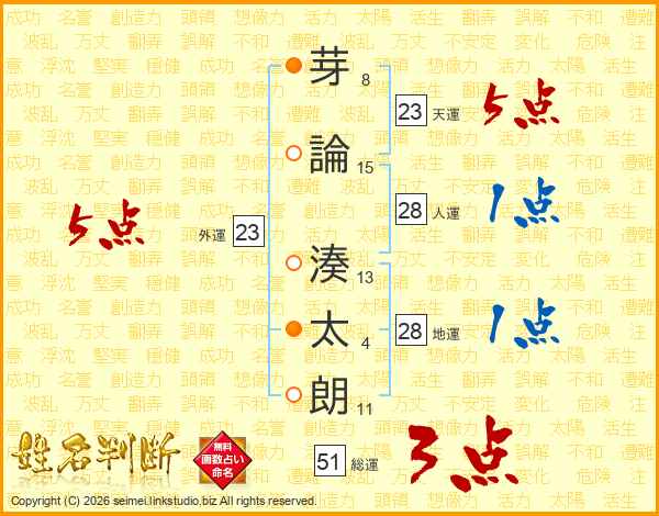 芽(8画)論(15画) 湊(13画)太(4画)朗(11画)