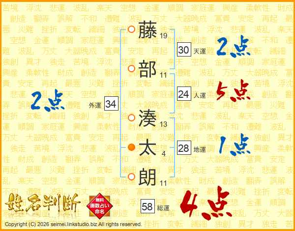 藤(19画)部(11画) 湊(13画)太(4画)朗(11画)