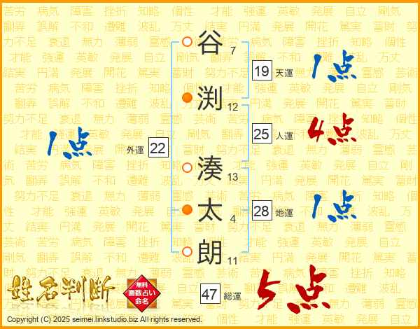 谷(7画)渕(12画) 湊(13画)太(4画)朗(11画)