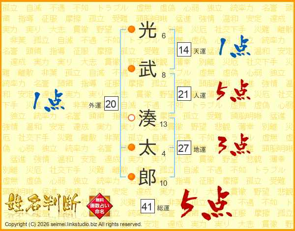 光(6画)武(8画) 湊(13画)太(4画)郎(10画)