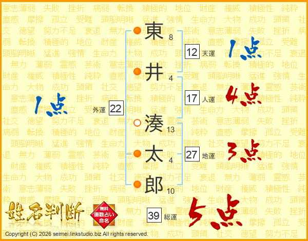 東(8画)井(4画) 湊(13画)太(4画)郎(10画)