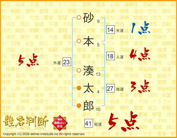 砂(9画)本(5画) 湊(13画)太(4画)郎(10画)
