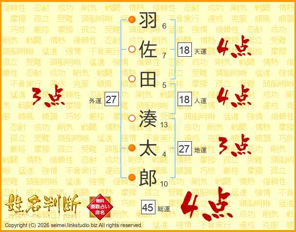 羽(6画)佐(7画)田(5画) 湊(13画)太(4画)郎(10画)