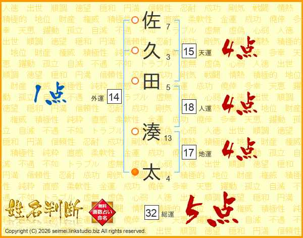 佐(7画)久(3画)田(5画) 湊(13画)太(4画)