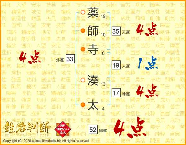 薬師寺湊太さんの総運は52画の4点!
