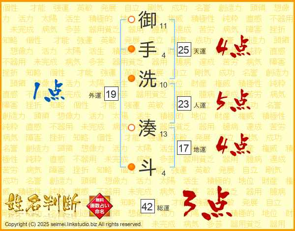 生活面を象徴する運勢です。外部から受ける影響力を表し、結婚運、家庭運や職場、環境への順応性を表します。総運から人運を引いた画数。姓や名が1文字の場合を除く。