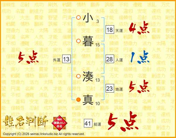 生活面を象徴する運勢です。外部から受ける影響力を表し、結婚運、家庭運や職場、環境への順応性を表します。総運から人運を引いた画数。姓や名が1文字の場合を除く。