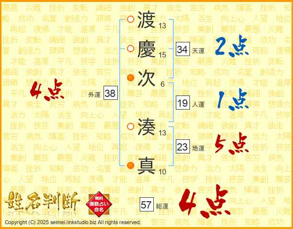 渡(13画)慶(15画)次(6画) 湊(13画)真(10画)