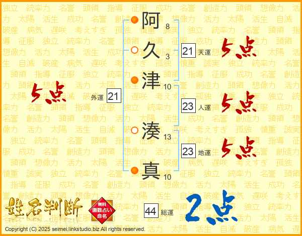 阿(8画)久(3画)津(10画) 湊(13画)真(10画)