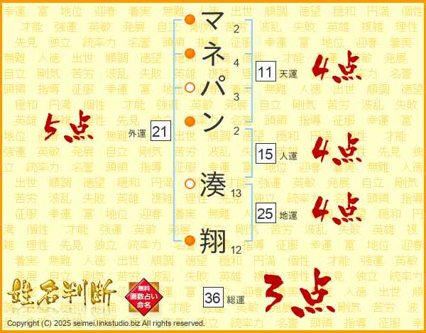 マ(2画)ネ(4画)パ(3画)ン(2画) 湊(13画)翔(12画)