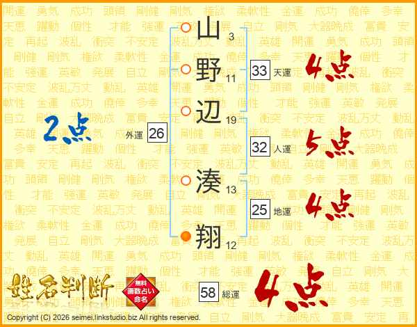 山(3画)野(11画)辺(19画) 湊(13画)翔(12画)