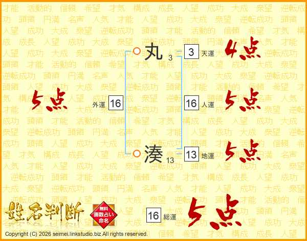 あなたの人生を表す1番重要な運勢です。生涯を通じて影響する総合運となり、主に50歳以降の晩年期に影響を及ぼします。苗字と名前の合計画数。