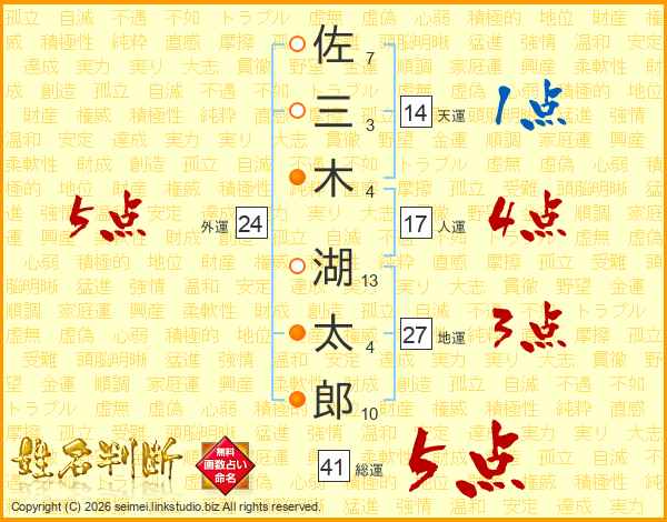 佐(7画)三(3画)木(4画) 湖(13画)太(4画)郎(10画)
