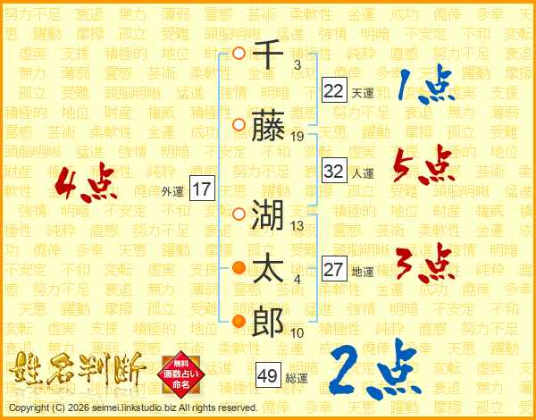 千(3画)藤(19画) 湖(13画)太(4画)郎(10画)
