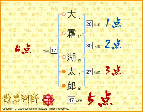 大(3画)霜(17画) 湖(13画)太(4画)郎(10画)