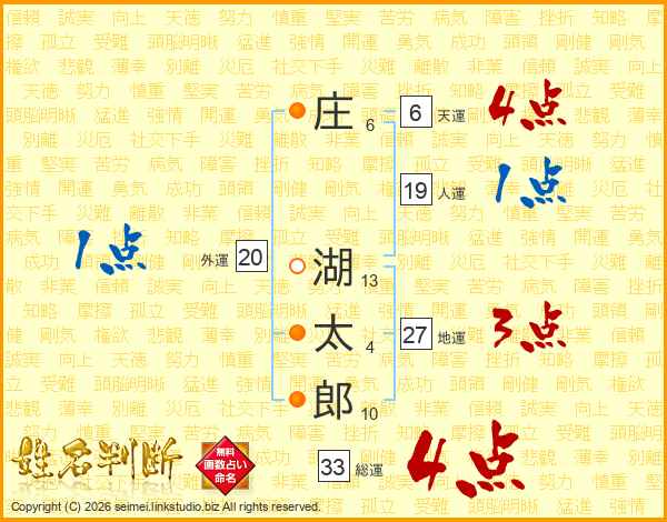 庄(6画) 湖(13画)太(4画)郎(10画)