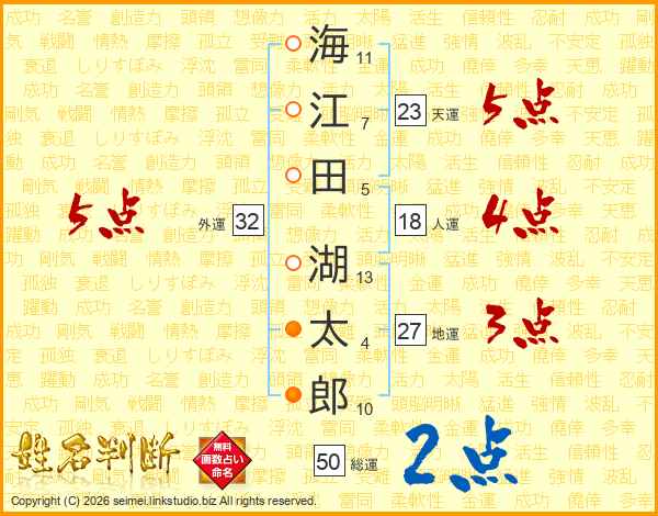 海(11画)江(7画)田(5画) 湖(13画)太(4画)郎(10画)