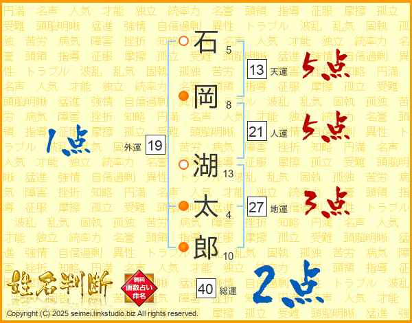石(5画)岡(8画) 湖(13画)太(4画)郎(10画)