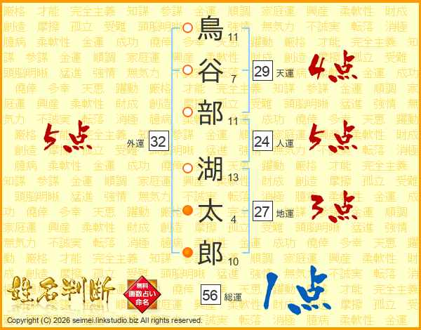 鳥(11画)谷(7画)部(11画) 湖(13画)太(4画)郎(10画)