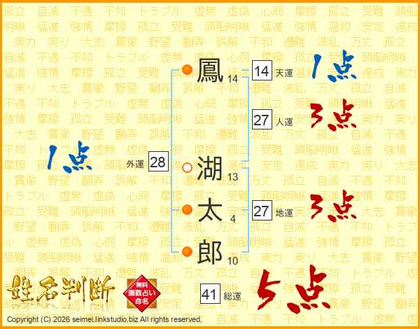 鳳(14画) 湖(13画)太(4画)郎(10画)