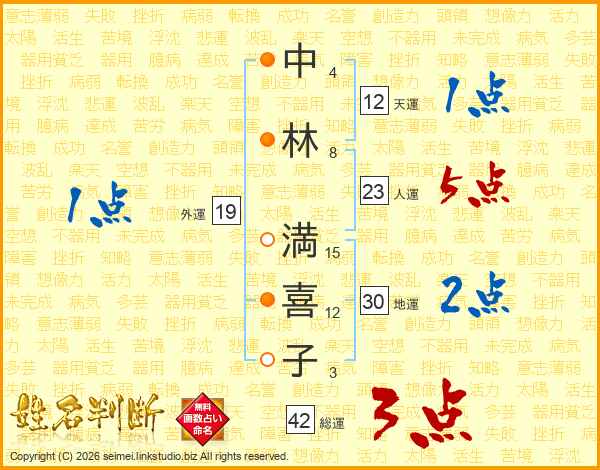 中(4画)林(8画) 満(15画)喜(12画)子(3画)