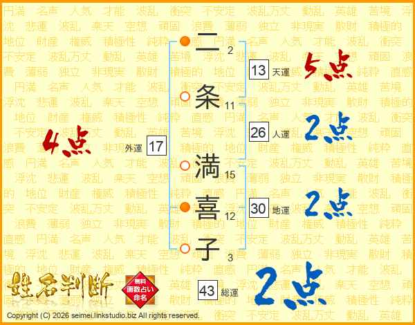 二(2画)条(11画) 満(15画)喜(12画)子(3画)