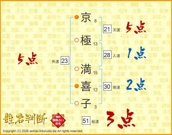 京(8画)極(13画) 満(15画)喜(12画)子(3画)