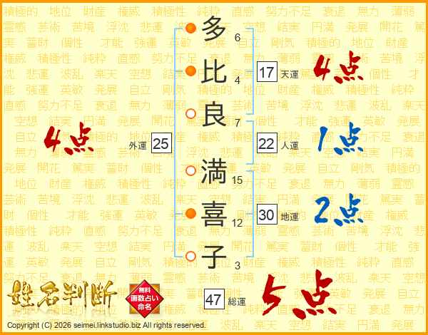 多(6画)比(4画)良(7画) 満(15画)喜(12画)子(3画)