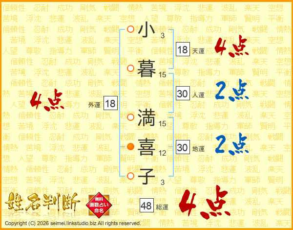小(3画)暮(15画) 満(15画)喜(12画)子(3画)