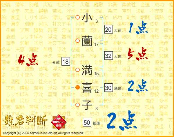 小(3画)薗(17画) 満(15画)喜(12画)子(3画)