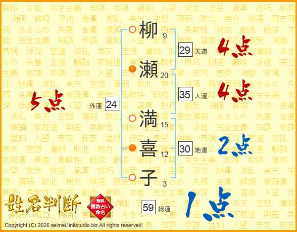 柳(9画)瀬(20画) 満(15画)喜(12画)子(3画)