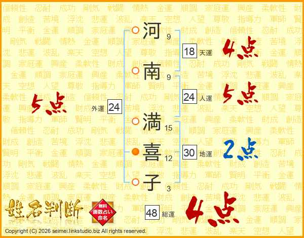 河(9画)南(9画) 満(15画)喜(12画)子(3画)