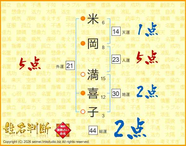 米(6画)岡(8画) 満(15画)喜(12画)子(3画)