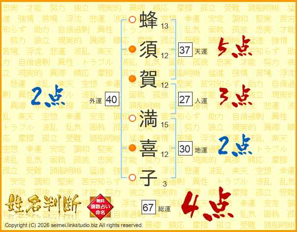 蜂須賀満喜子さんの総運は67画の4点!