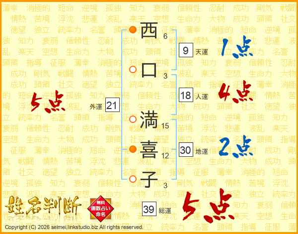 西(6画)口(3画) 満(15画)喜(12画)子(3画)